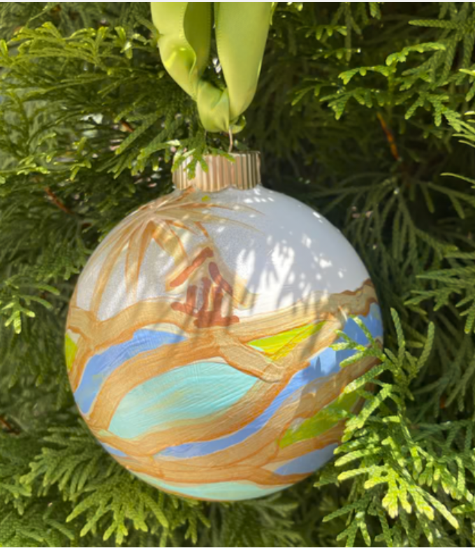 -4" diameter glass ball ornament; white with blues, greens, and aquas with gold accents