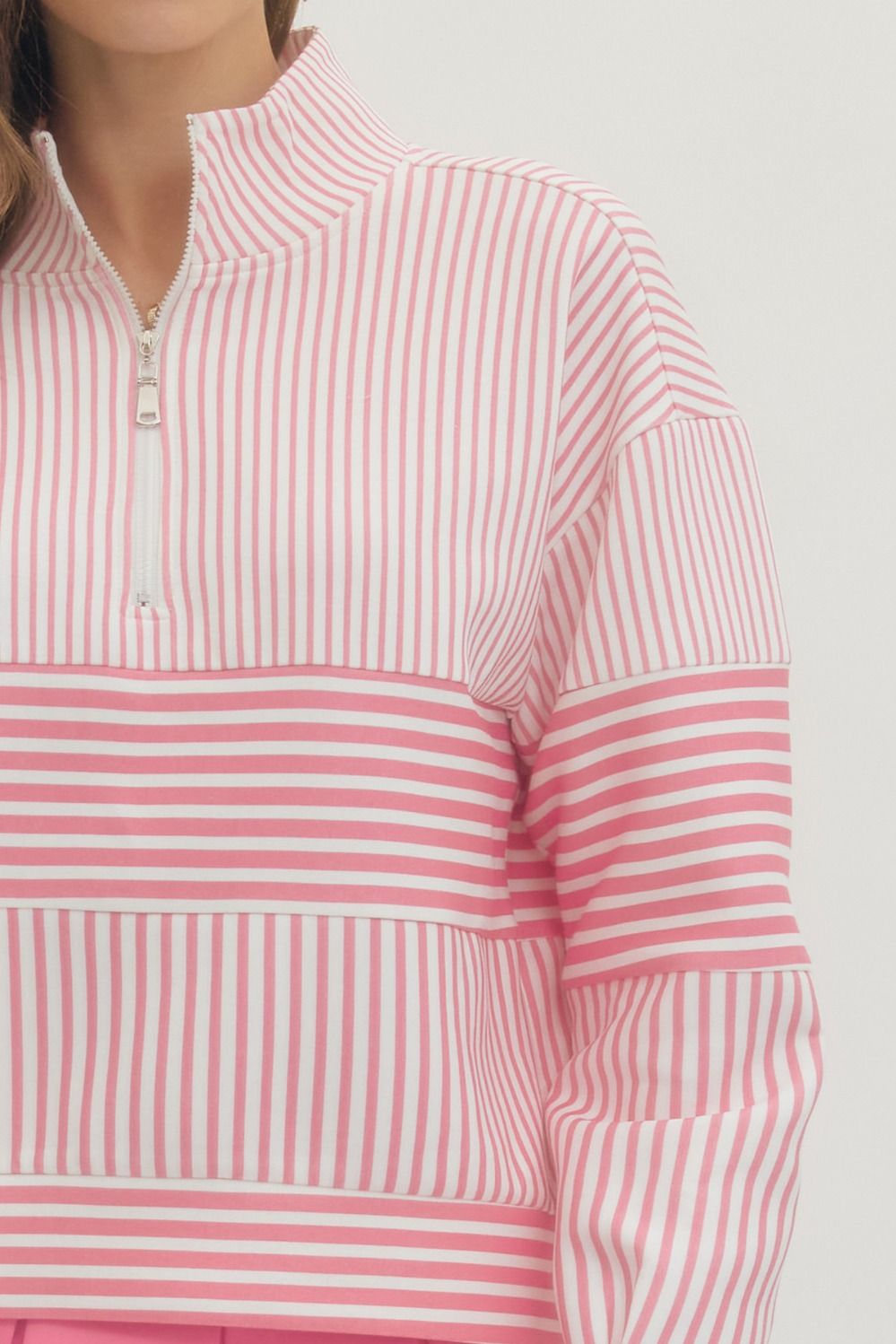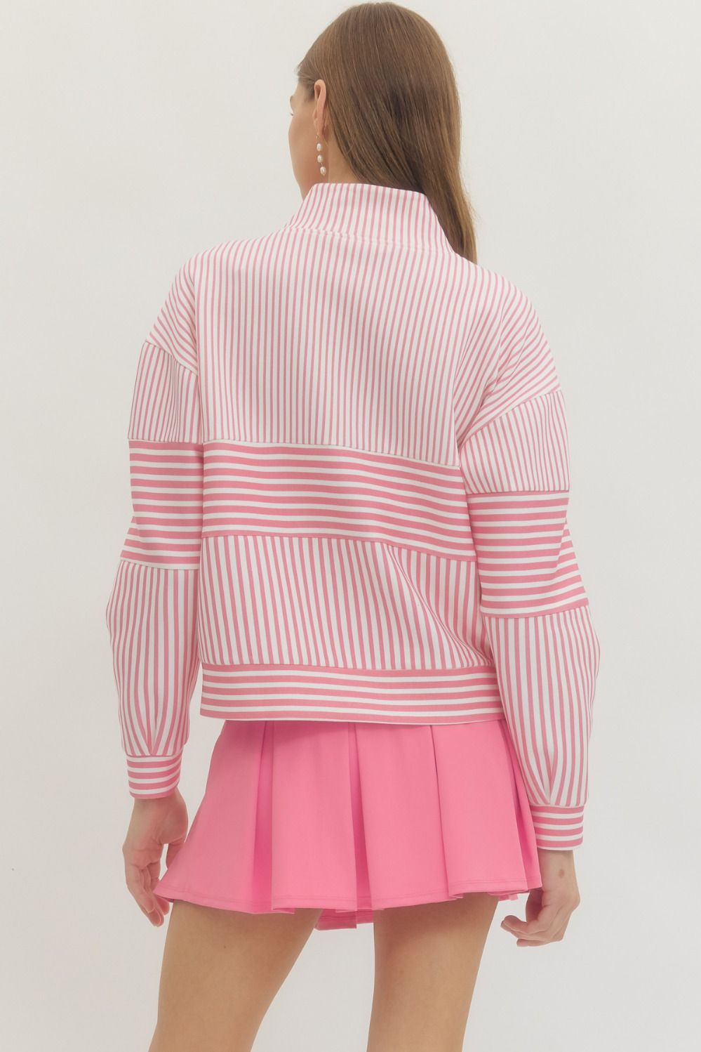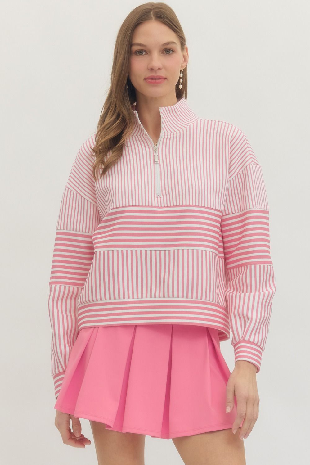 Sporty meets sweet in The Pink Prep Half-Zip Pullover! Designed with classic pink and white stripes and a flattering half-zip neckline, this piece blends polished structure with playful charm. The mixed stripe detailing and relaxed fit give it a modern, elevated feel while keeping it ultra-comfortable.