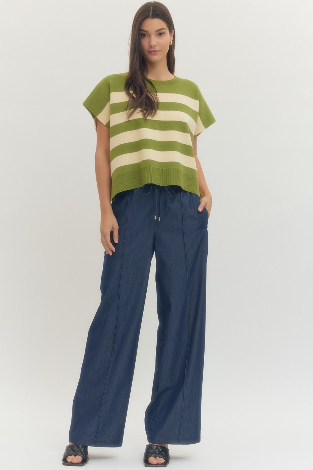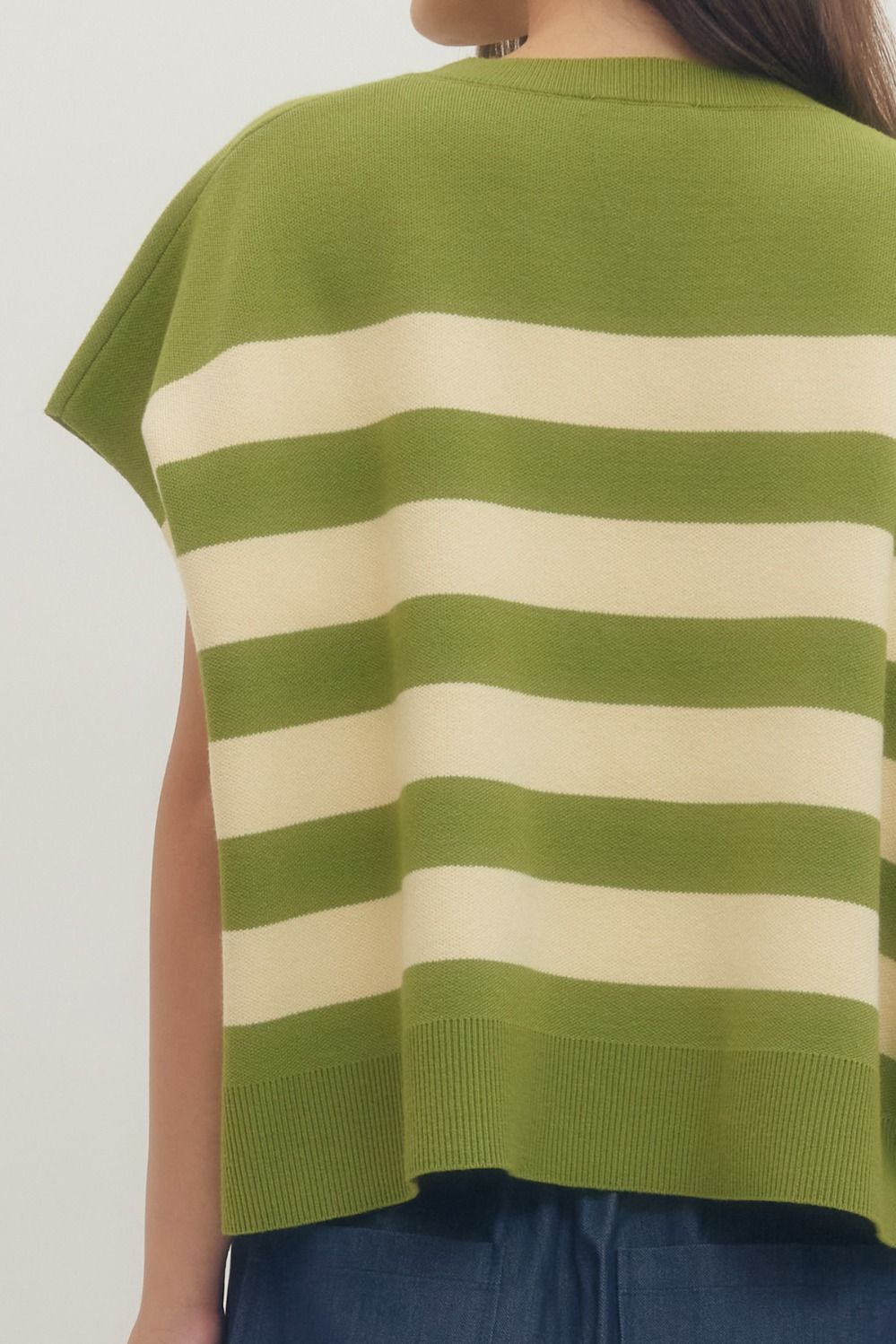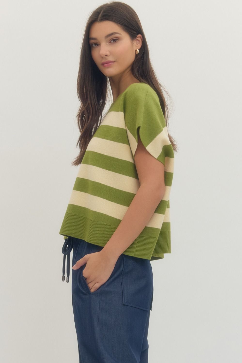 The Matcha Moment Knit Top is that easy, elevated piece your wardrobe has been waiting for. Designed in a refreshing matcha green with soft cream horizontal stripes, this knit blends classic styling with a modern, relaxed silhouette.