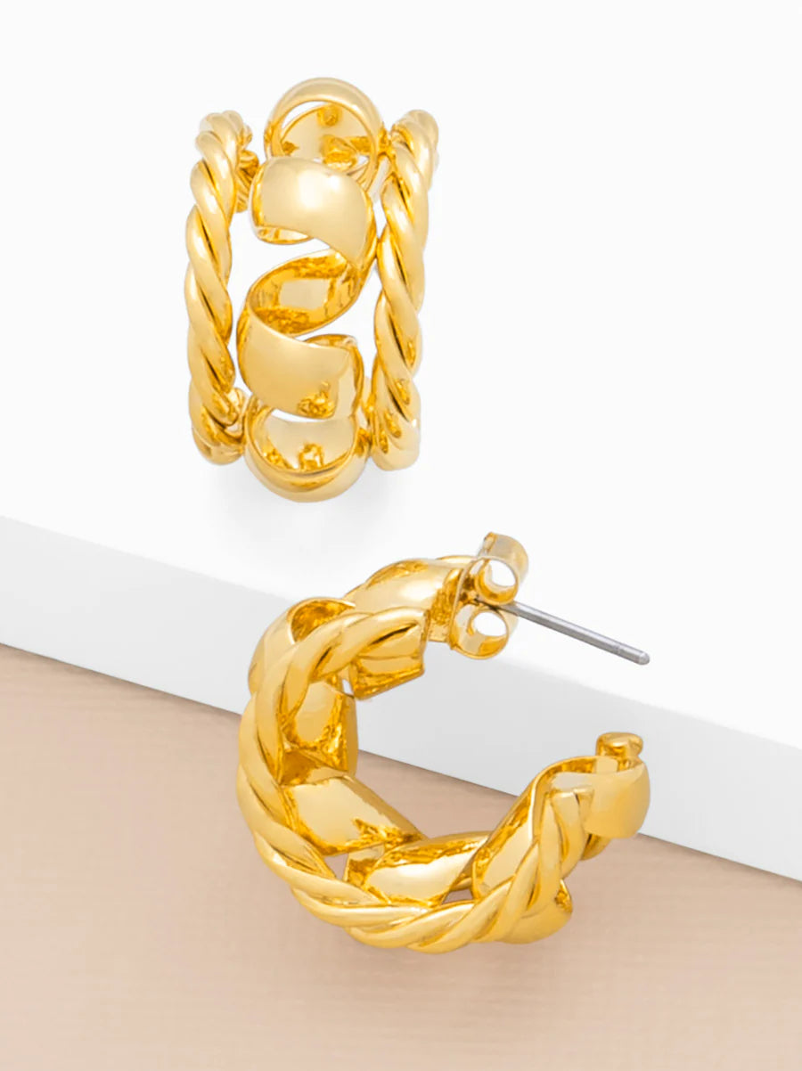 Small huggie earring plated in 18K gold, featuring ribbon and braid embellishments.