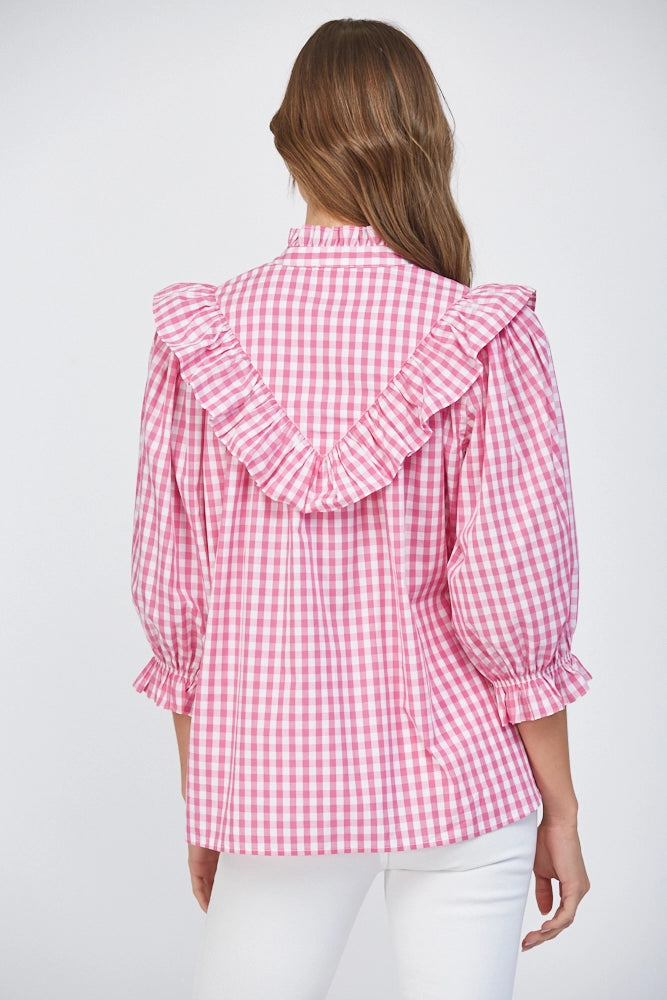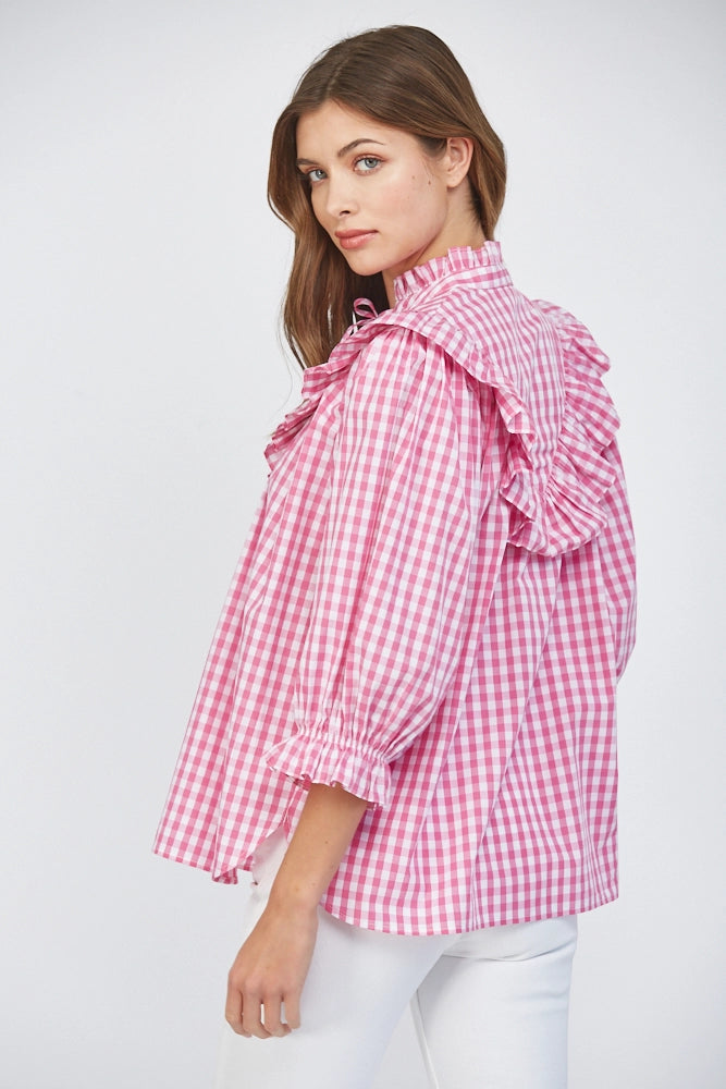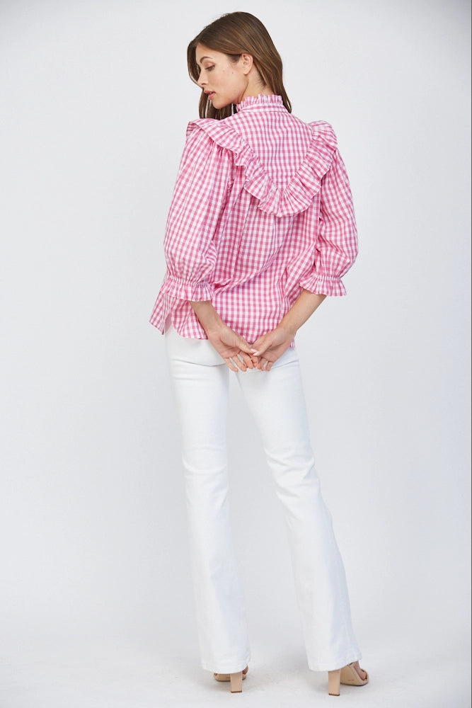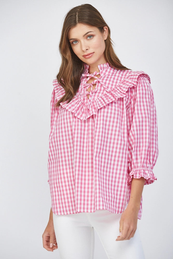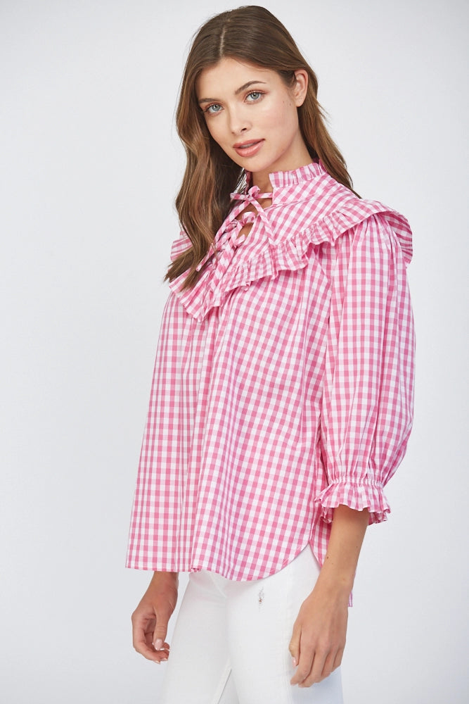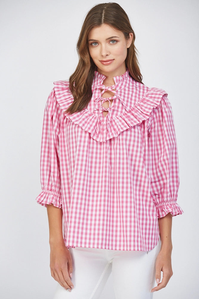 Meet your new statement blouse — a pink and white gingham beauty that blends classic Southern style with feminine details we can’t get enough of. Designed with a relaxed, easy silhouette, this top features a standout ruffle bib collar that frames the neckline beautifully, along with delicate lace-up detailing at the front for an extra touch of interest. The soft puff sleeves and elastic ruffle cuffs add just the right amount of volume while keeping the fit comfortable and flattering.