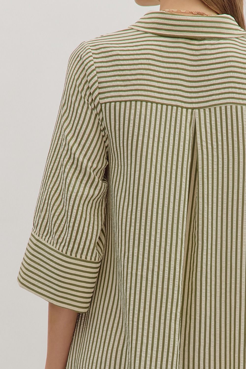 Chic, effortless, and endlessly wearable — The Brooks Striped Maxi Dress is a timeless favorite for any season. Designed in classic olive green and white stripes, this flowy maxi features a collared neckline and ¾-length sleeves for a polished yet relaxed feel. Working buttons line the front for a functional finish, while hidden side pockets add everyday ease. It’s the perfect blend of casual charm and elevated style.