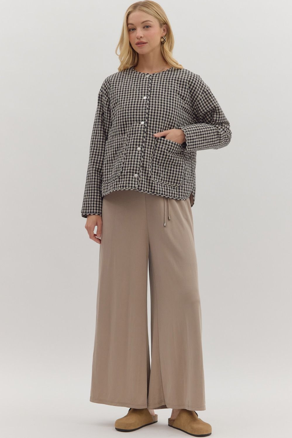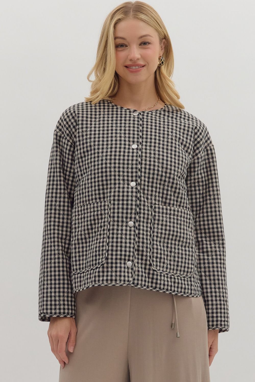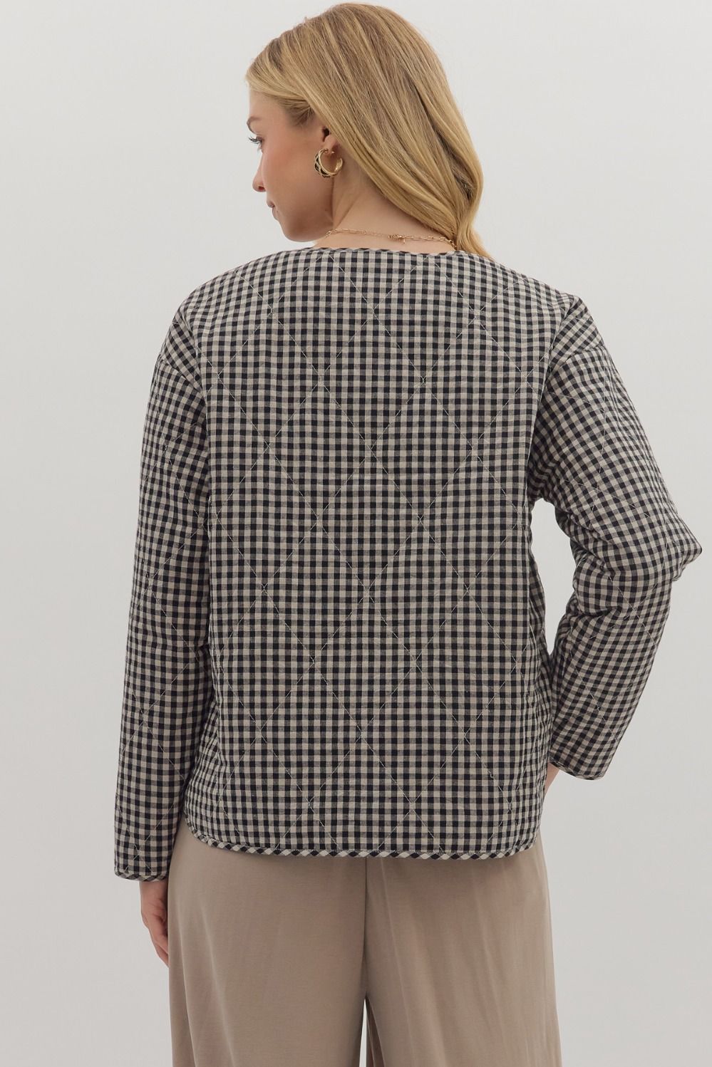 Playful yet polished, this gingham jacket is the layering piece you didn’t know your closet needed. Its timeless black-and-cream check print is elevated with diamond quilting, giving it a cozy, textured look that feels both classic and modern.