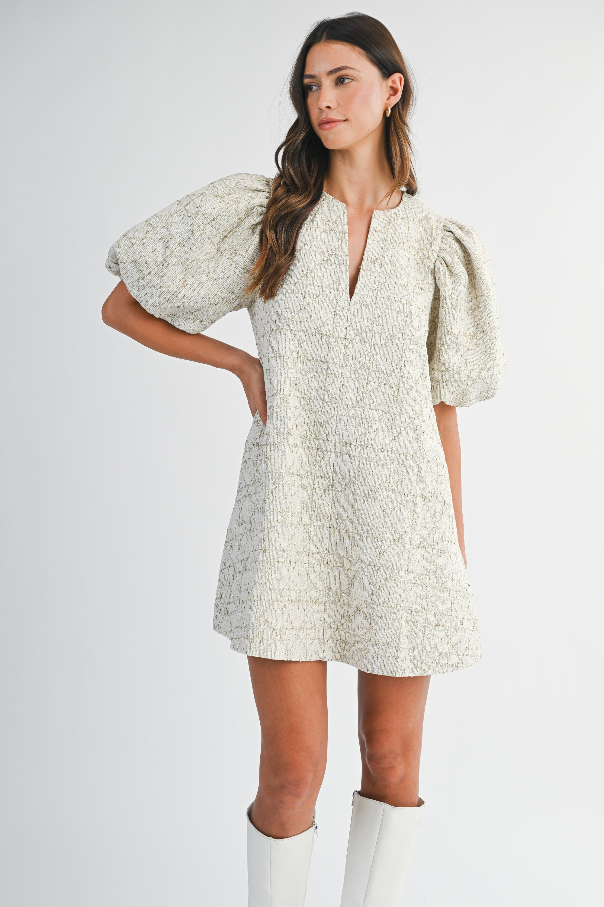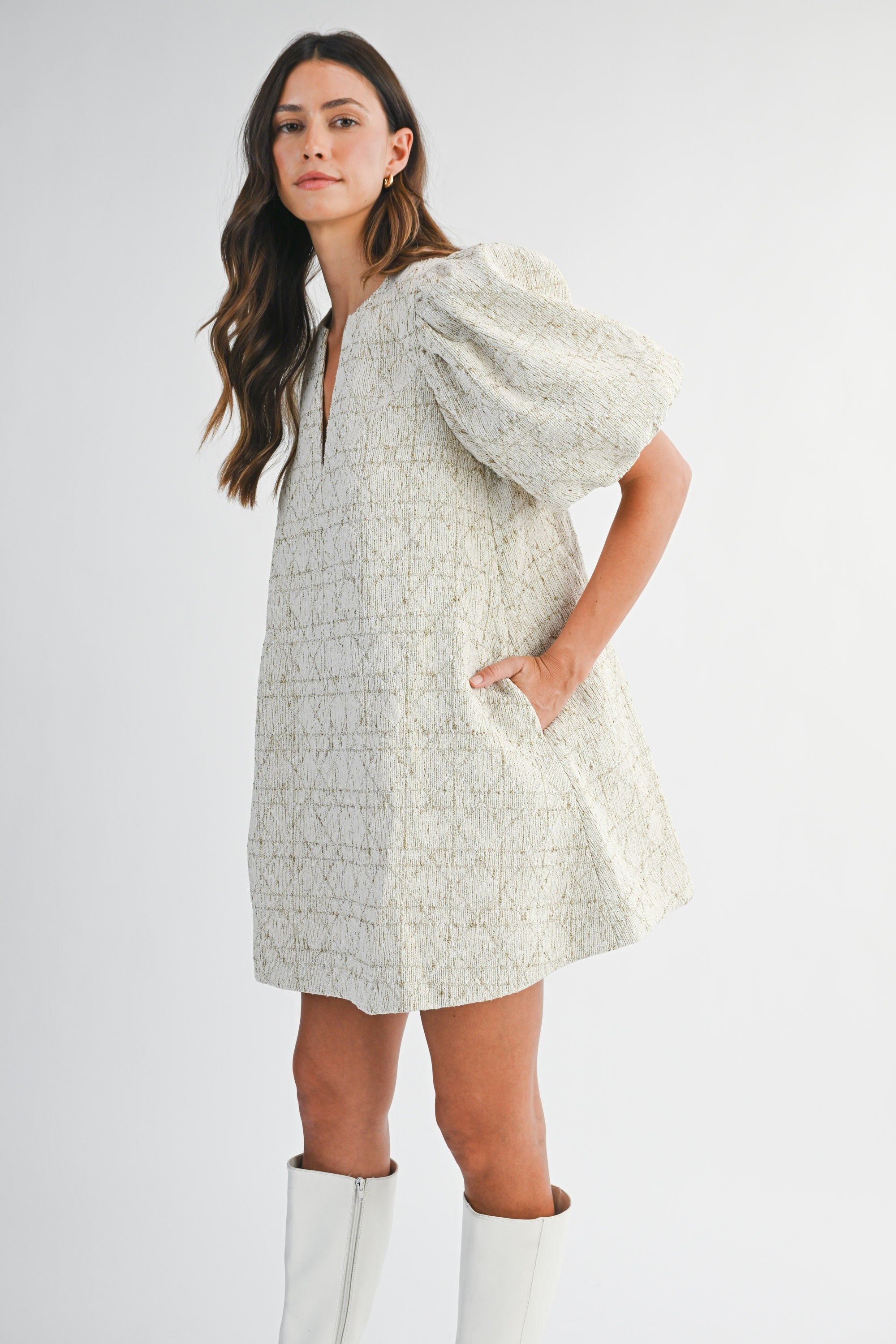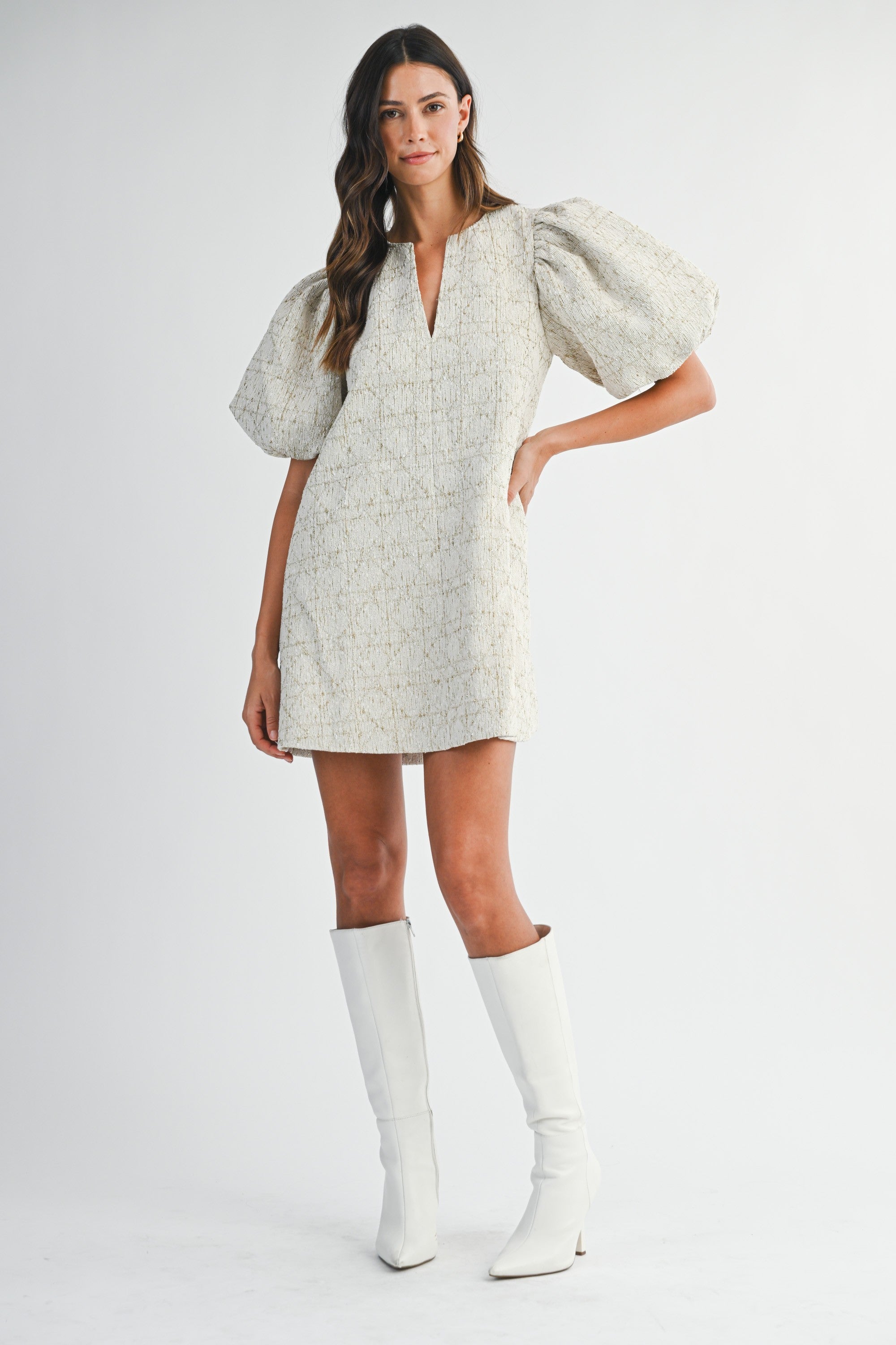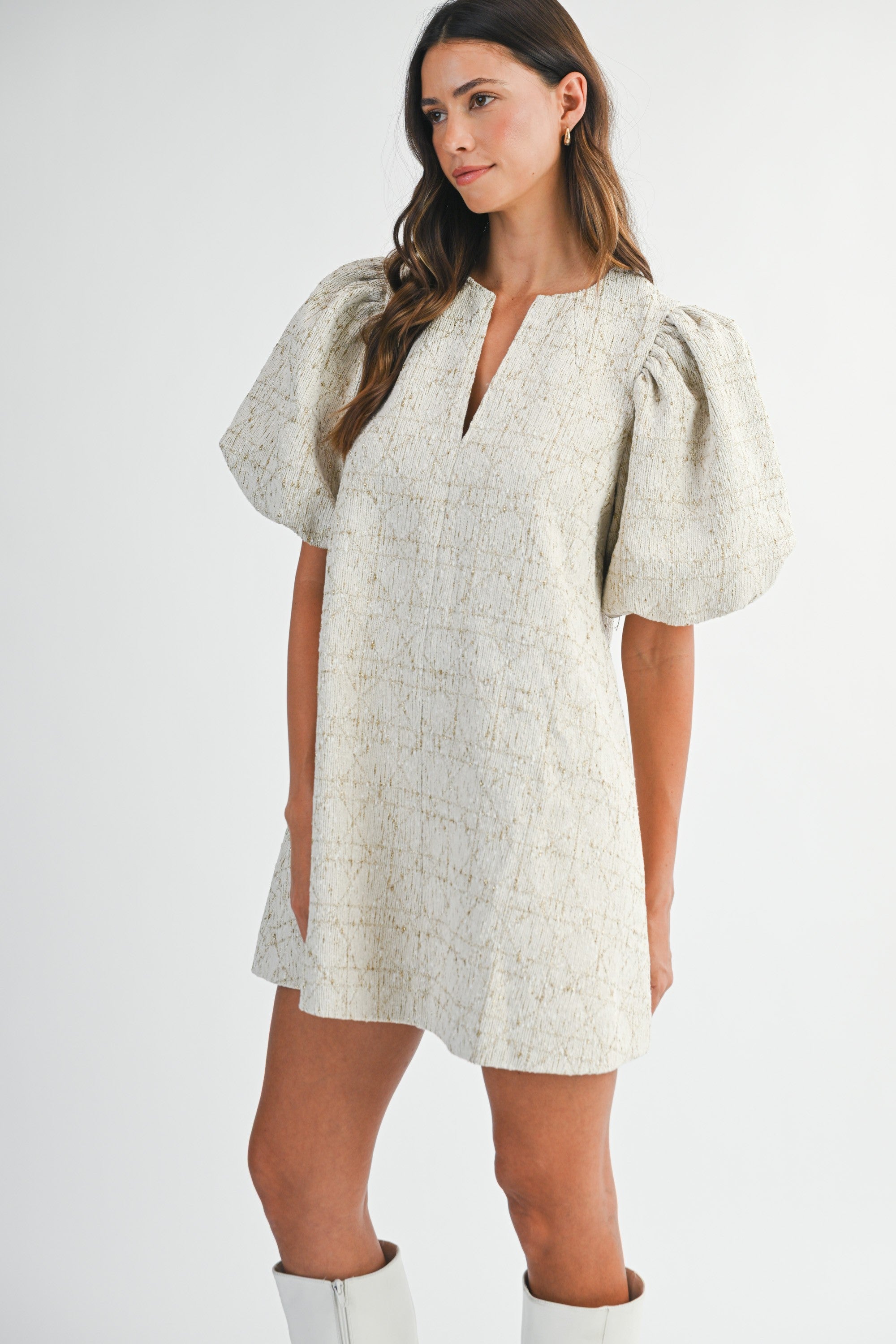 Classic tweed meets modern chic in this statement mini dress. Designed with a timeless cream-and-gold woven tweed, this piece brings instant polish while still feeling fresh and playful. The voluminous puff sleeves add drama and structure, perfectly balanced by the easy A-line silhouette that flatters every shape. A subtle split neckline draws the eye upward, adding just the right amount of edge to this sophisticated look.