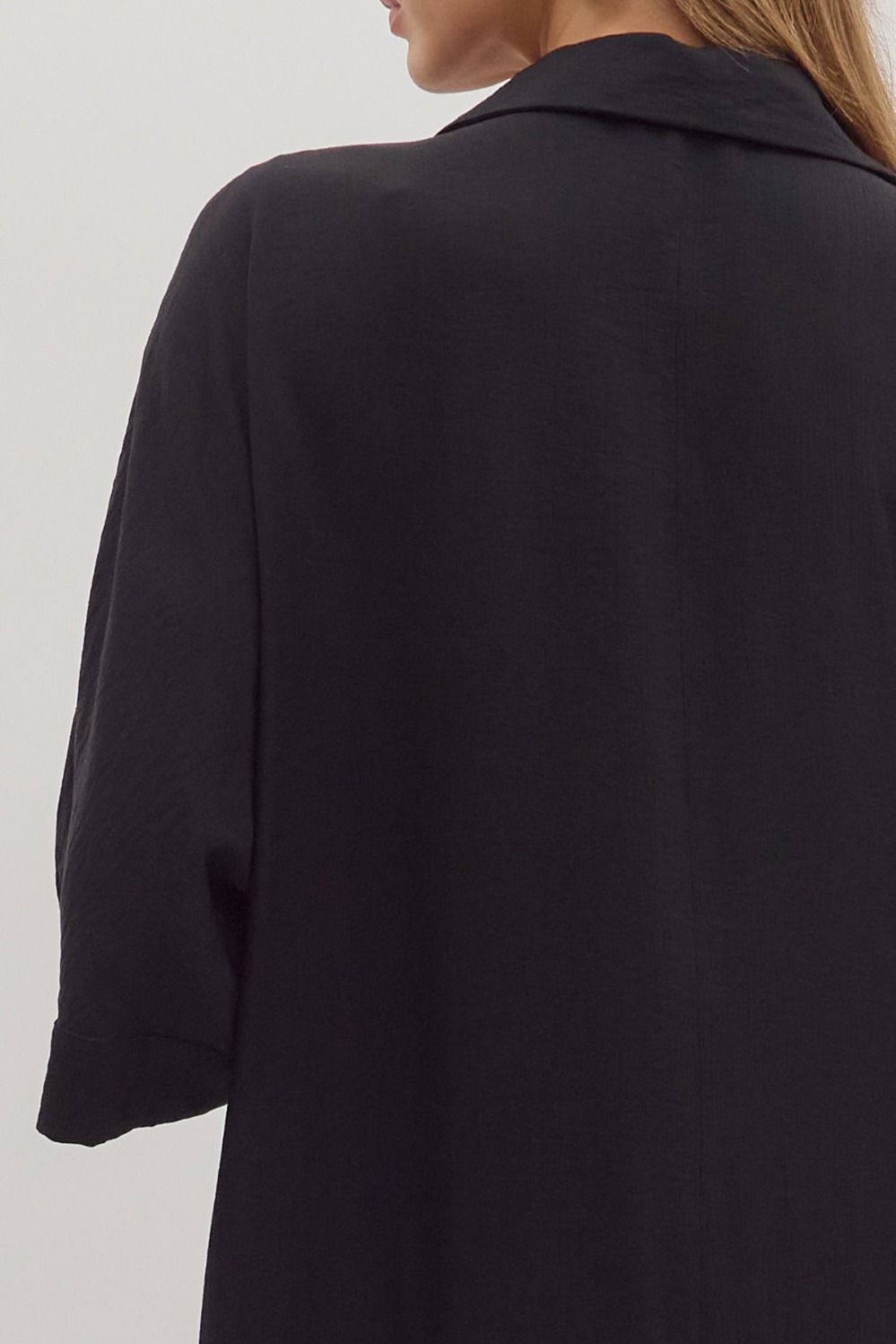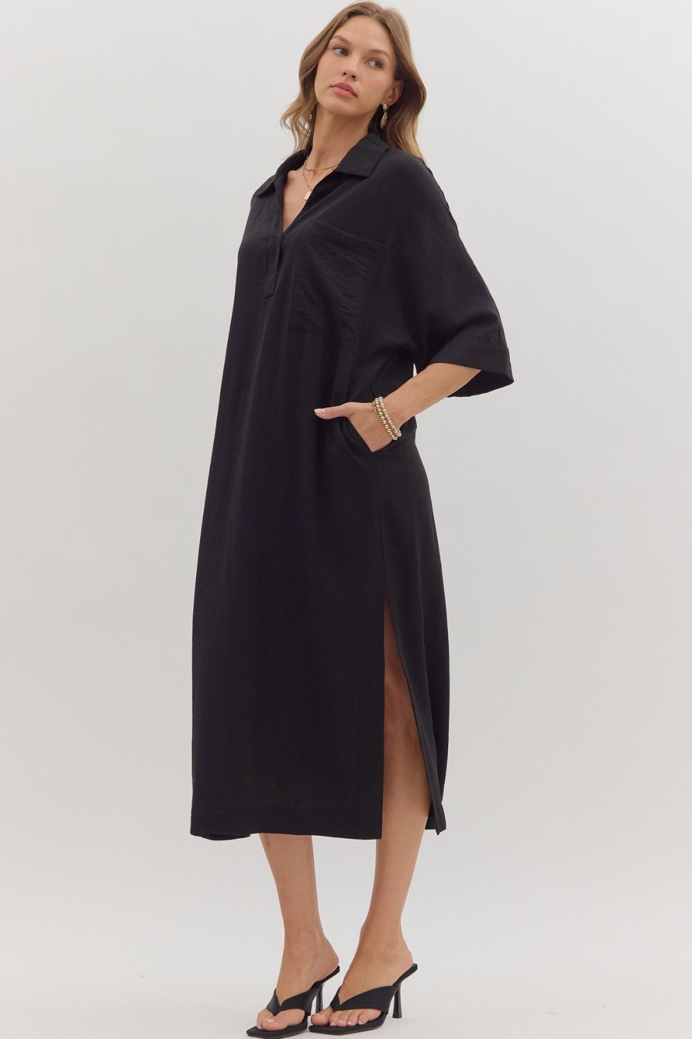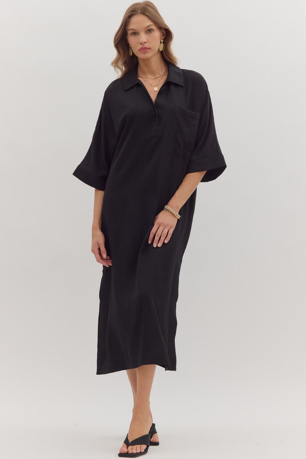 Easy, breezy, and endlessly stylish—this caftan dress is your new go-to for elevated comfort. Crafted in a classic black hue, it features an airy, relaxed silhouette that drapes beautifully without sacrificing polish. The collared neckline with a partial button placket gives it that subtle tailored touch, while the roomy short sleeves and side slit hem keep it flowy and flattering.