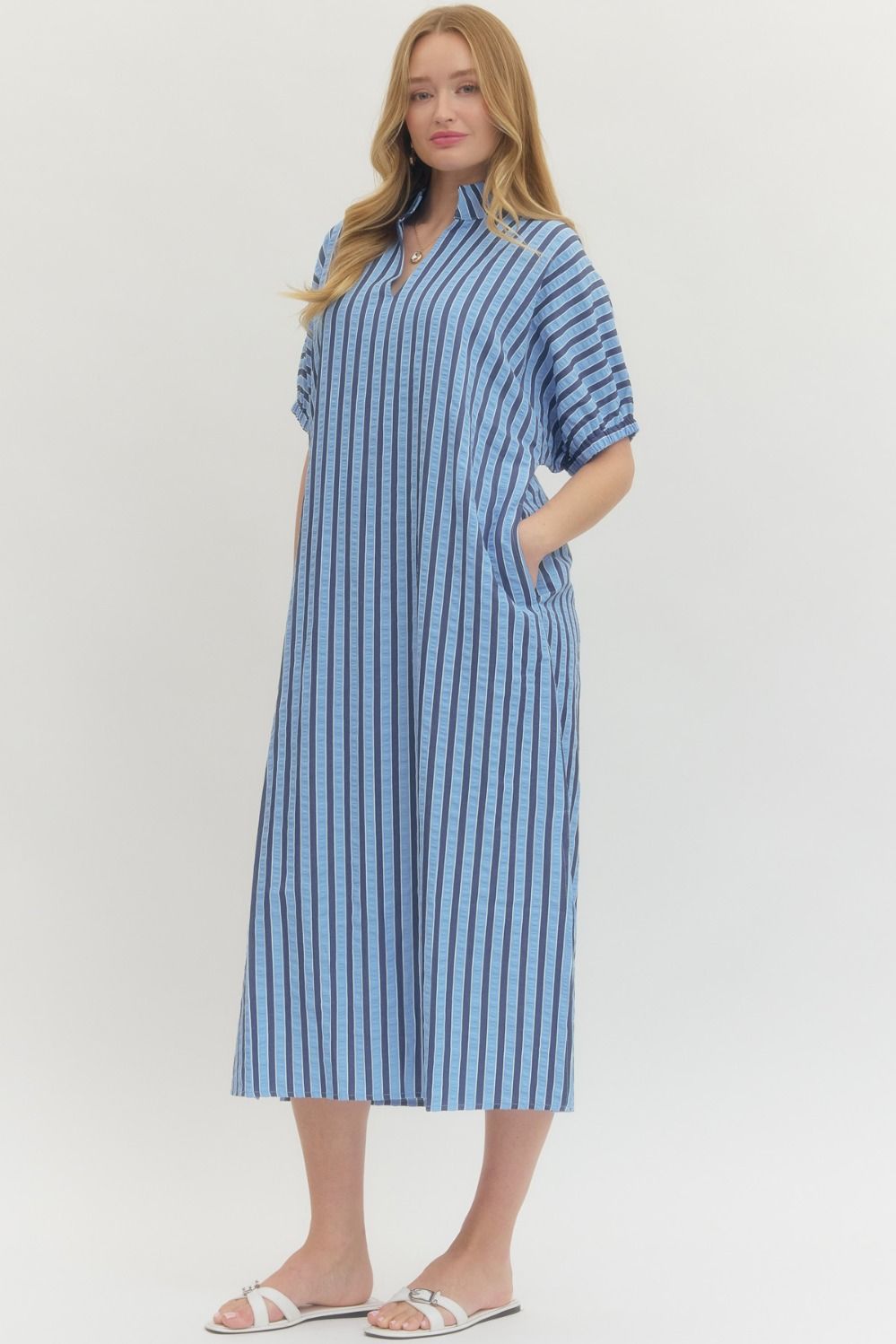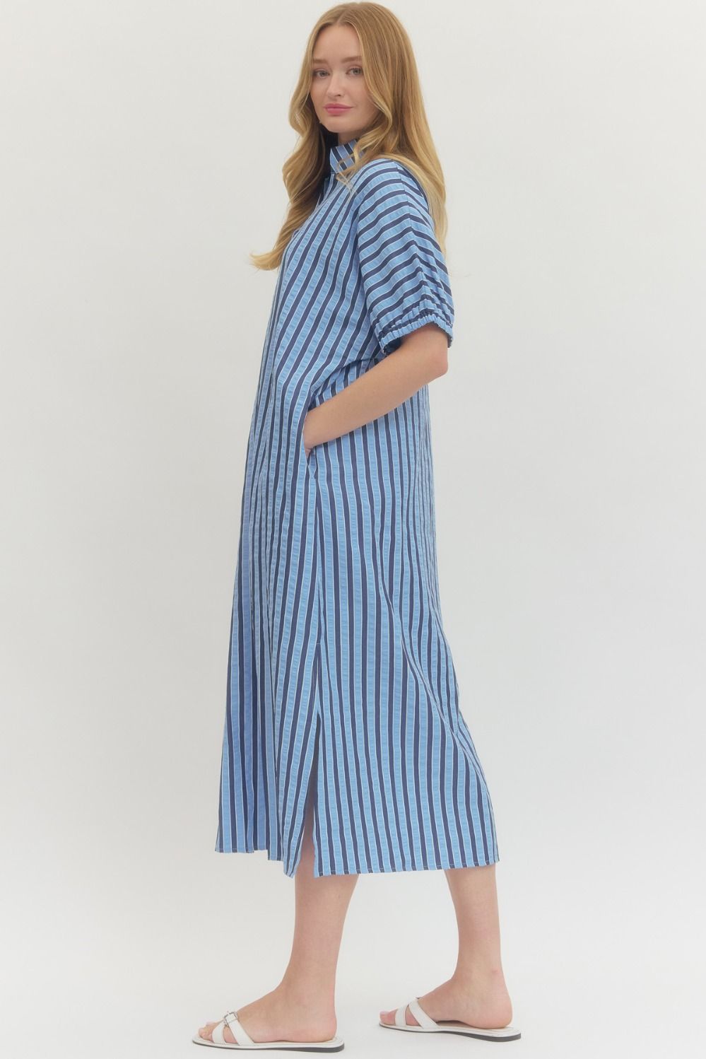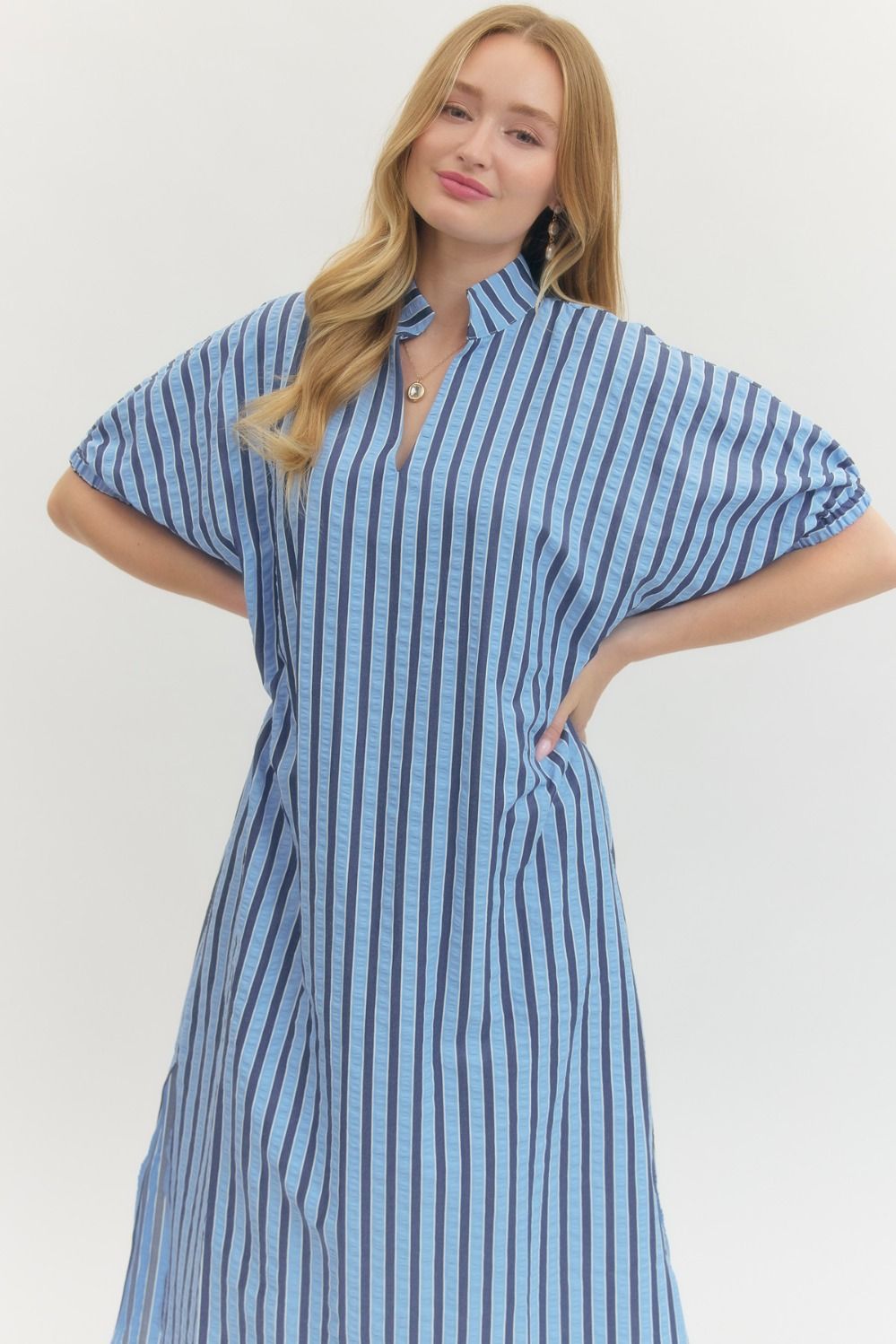 Effortlessly polished and easy to wear, The Seaside Stroll Midi Dress features classic vertical navy and blue stripes in a relaxed, flowy silhouette. The split neckline and soft stand collar add subtle structure, while the short sleeves and midi length keep it breezy and comfortable. And yes — it has pockets.